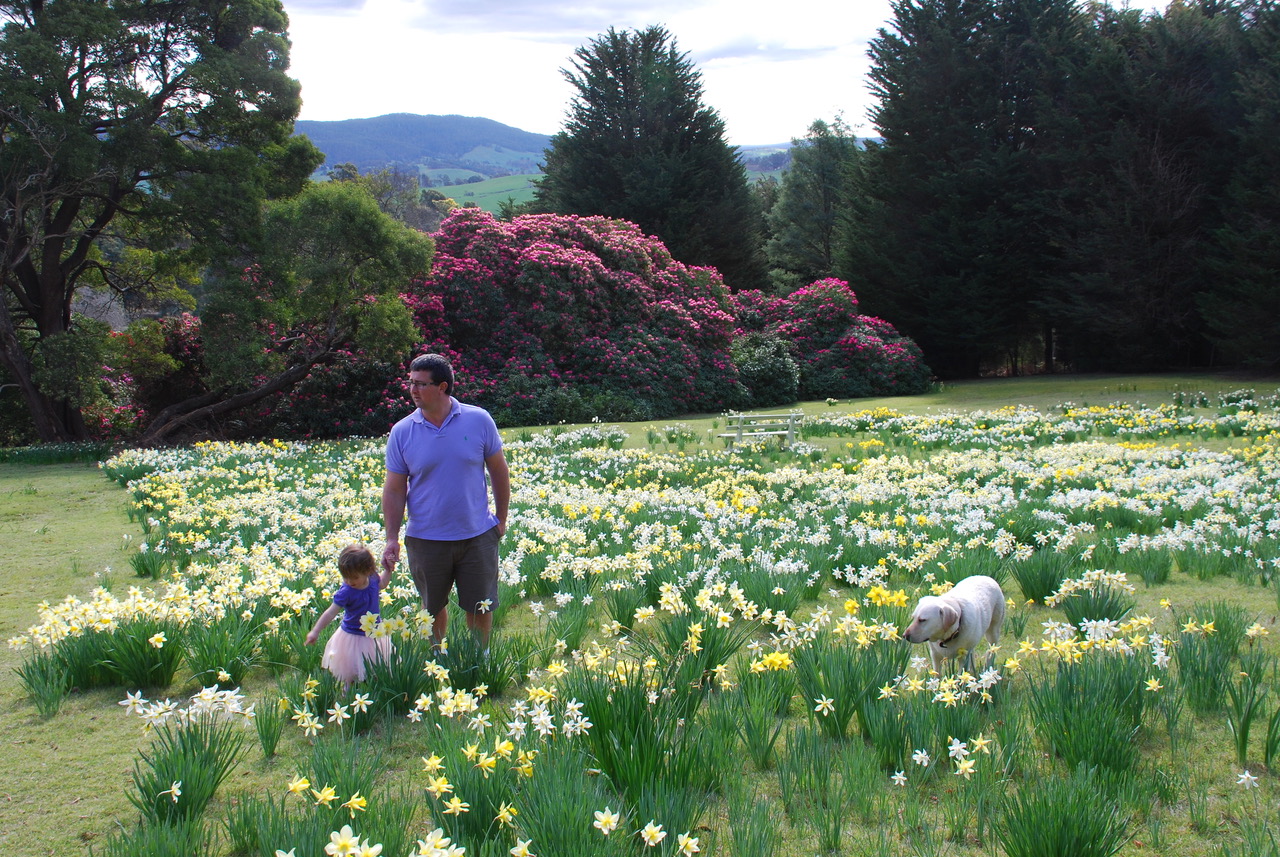 Daffodil Field – September is the month for the daffodil display. Massed plantings of daffodils occur in several places across the gardens including around the chapel, along the vireya trail and near the private residence. However a large field of mixed daffodils naturalised below the BBQ’s in the main garden, provide a stunning display of hundreds of thousands of blooms. One of the largest rhododendrons also blooms at this time providing a crimson backdrop to this amazing sight each year.